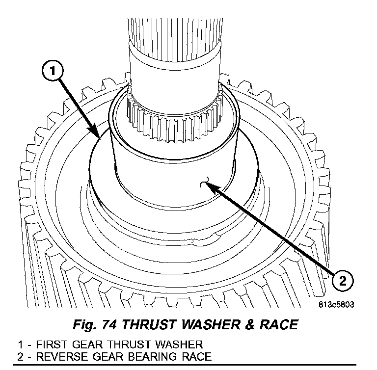 16. Using welding gloves or tongs, install first gear thrust washer (1) (Fig. 74) then reverse gear bearing race (2).