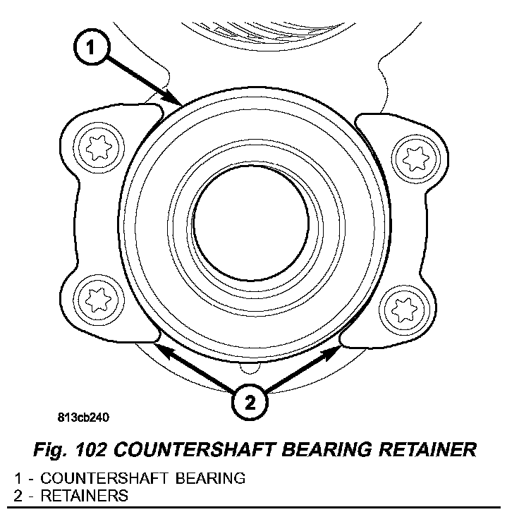 6. Install countershaft bearing (1) (Fig. 102) retainers (2) and tighten bolts to 10 Nm (88 inch lbs.).