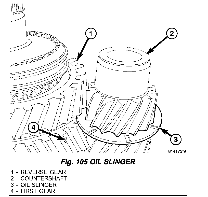 3. Install oil slinger (3) on countershaft (2) between reverse (1) and first gear (4) (Fig. 105).