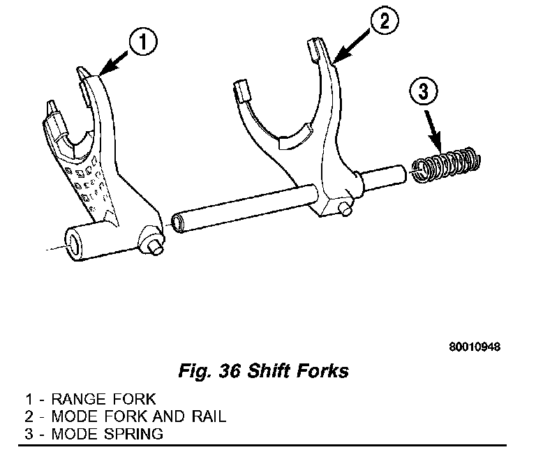 Check condition of the shift forks and mode fork shift rail (Fig. 36). Minor nicks on the shift rail can be smoothed with 320 - 400 grit emery cloth.