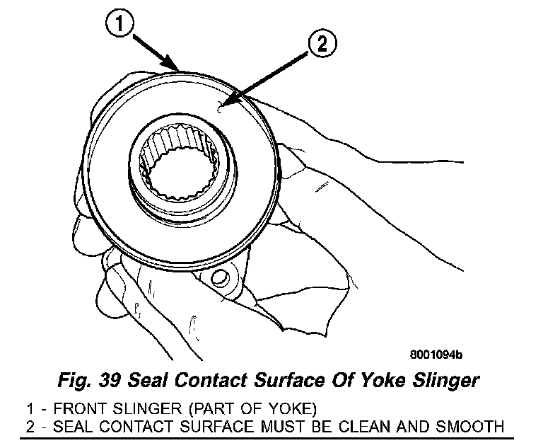 Check condition of the seal contact surfaces of the yoke slinger (Fig. 39). This surface must be clean and smooth to ensure proper seal life. Replace the yoke nut and seal washer as neither part should be reused.