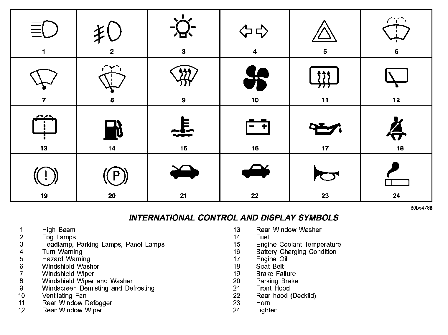 The graphic symbols illustrated in the following International Control and Display Symbols Chart are used to identify various instrument controls. The symbols correspond to the controls and displays that are located on the instrument panel.