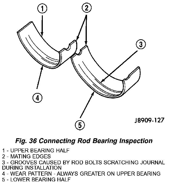 Inspect the connecting rod bearings for scoring and bent alignment tabs (Fig. 36) (Fig. 37). Check the bearings for normal wear patterns, scoring, grooving, fatigue and pitting (Fig. 38). Replace any bearing that shows abnormal wear.