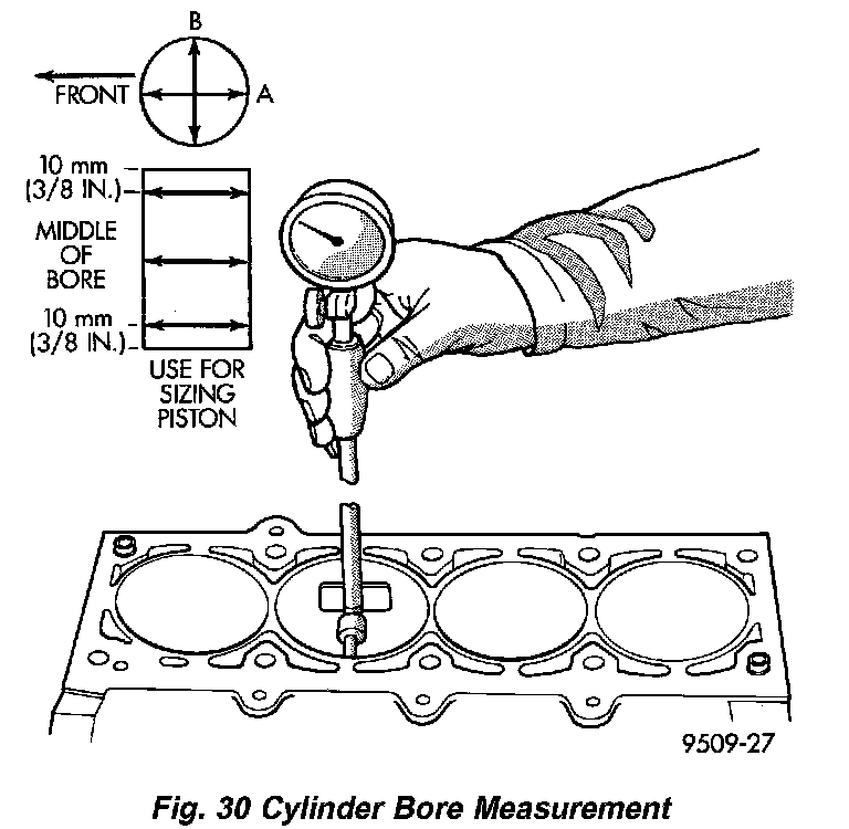 1. It is mandatory to use a dial bore gauge to measure each cylinder bore diameter (Fig. 30). To correctly select the proper size piston, a cylinder bore gauge, capable of reading in 0.003 mm (0.0001 inch) INCREMENTS is required. If a bore gauge is not available, do not use an inside micrometer.