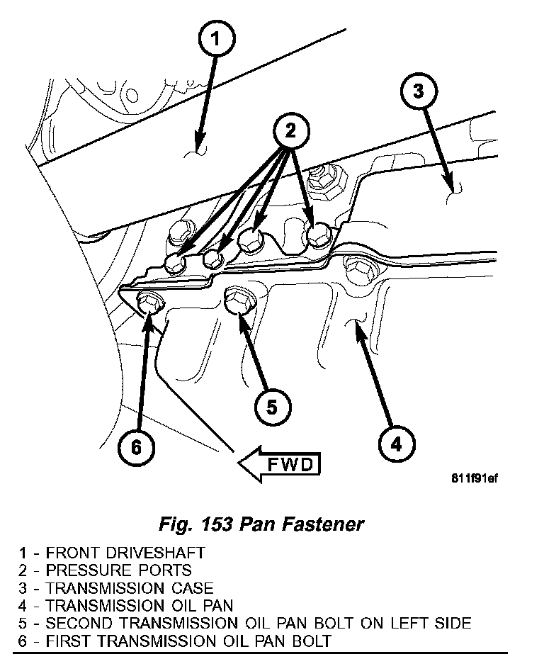 NOTE: Before installing the oil pan bolt (5) in the bolt hole located between the torque converter clutch on and U/D clutch pressure tap circuits (Fig. 153), it will be necessary to replenish the sealing patch on the bolt using Mopar Lock & Seal Adhesive.