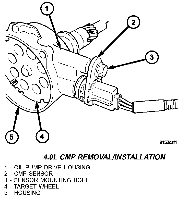 The Camshaft Position Sensor (CMP) on the 4.0L 6 cylinder engine (2) is bolted to the side of the oil pump drive shaft housing assembly (5)