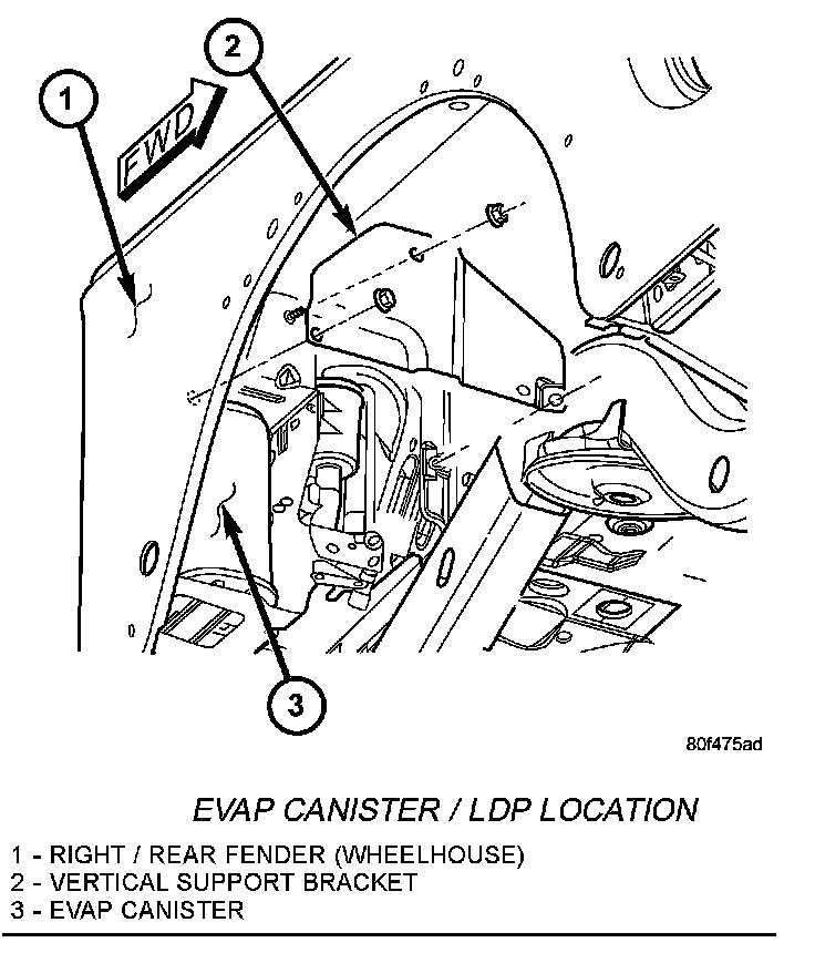 The Natural Vacuum Leak Detection (NVLD) pump (3) and EVAP canister (1) are attached to a common support bracket. This support assembly is located to the rear of the right / rear tire under the plastic wheelhouse liner. The NVLD pump filter is also located near the EVAP canister. The pump and filter are replaced (serviced) as one unit.