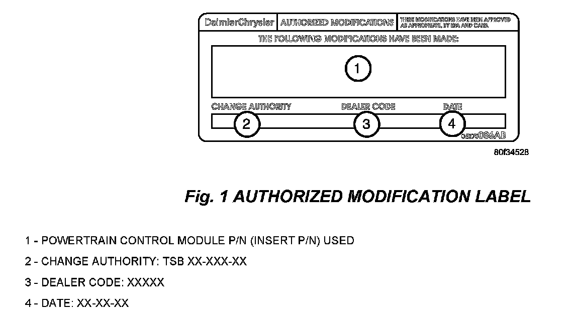 17. Type the necessary information on the "Authorized Modification Label p/n 04275086AB and attach near the VECI label (Fig. 1).