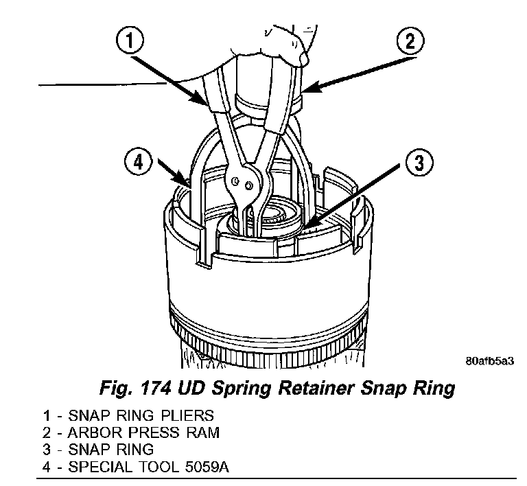 20. Using Tool 5059A (4) and an arbor press (2), compress UD clutch piston enough to remove snap ring (3) (Fig. 174).