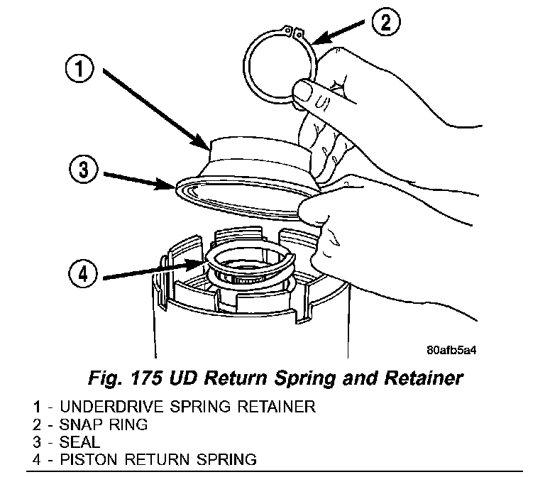 21. Remove the underdrive spring retainer snap ring (2), spring retainer (1), and spring (4) (Fig. 175).