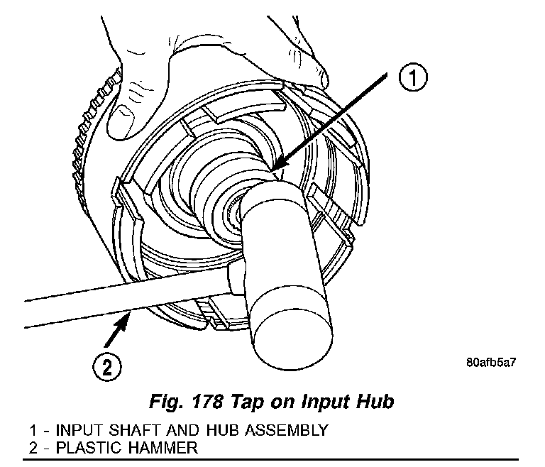 24. Tap on input hub (1) with soft faced hammer (2) and separate input hub from OD/Reverse piston and clutch retainer (Fig. 178).