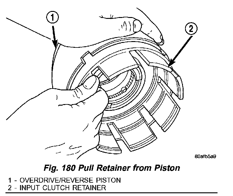 26. Separate clutch retainer (2) from OD/Reverse piston (1) (Fig. 180).