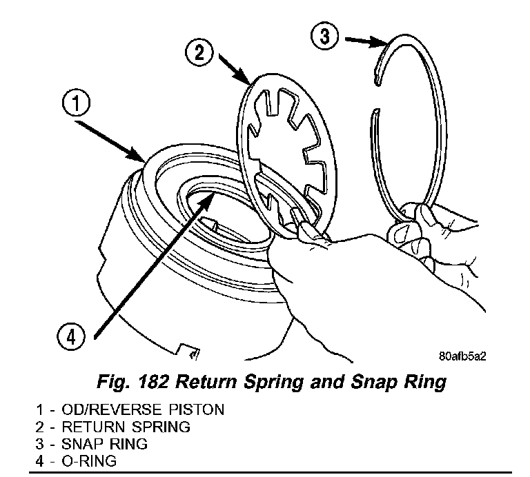 28. Remove the OD/Reverse piston (5) return spring and snap ring (3) (Fig. 182).
