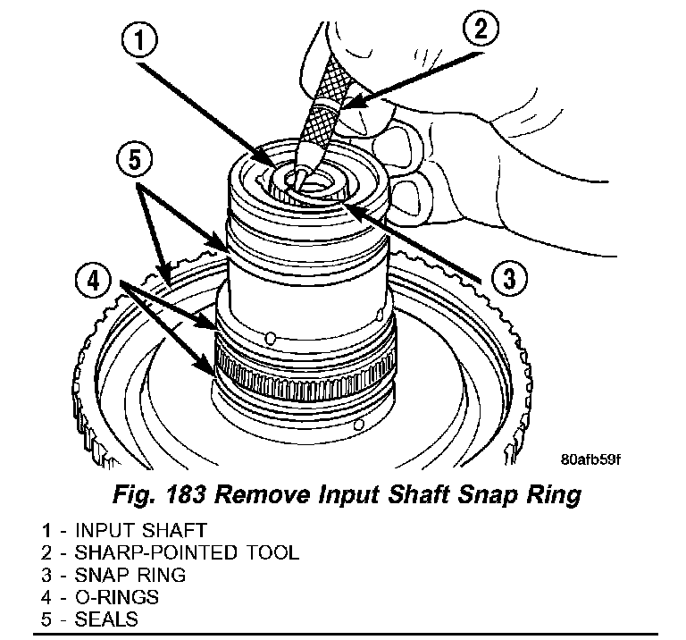 29. Remove input shaft (1) to input clutch hub snap ring (3) (Fig. 183).