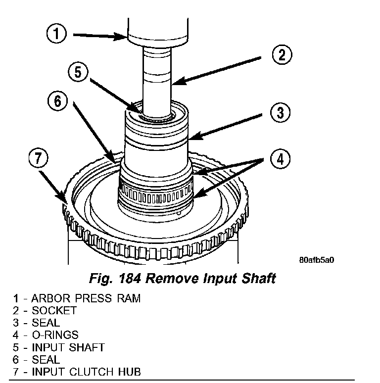 30. Using a suitably sized socket (2) and an arbor press (1), remove input shaft (5) from input shaft hub (Fig. 184).