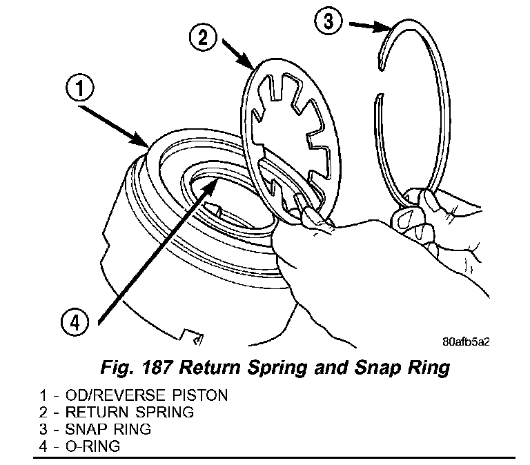 3. Position the OD/Reverse piston return spring (2) and snap ring (3) onto the OD/Reverse piston (1) (Fig. 187).