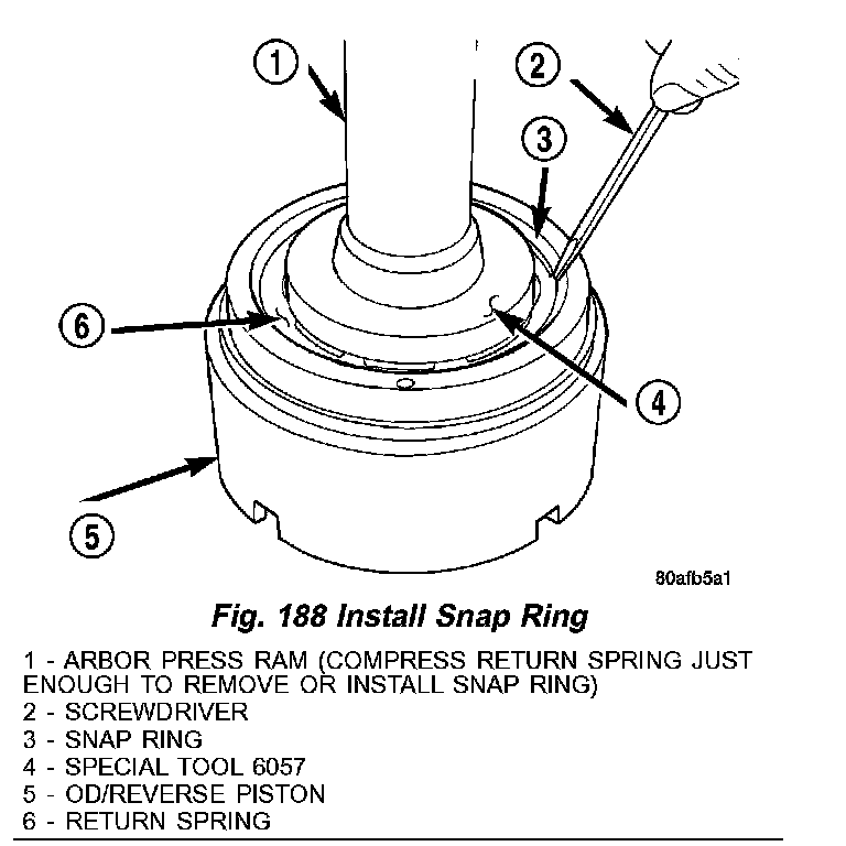 4. Using an arbor press (1) and Tool 6057 (4), install the OD/Reverse piston return spring (6) and snap ring (3) (Fig. 188).