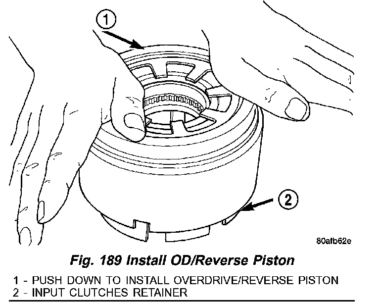 5. Install the OD/Reverse piston (1) assembly to the input clutch retainer (2) (Fig. 189).