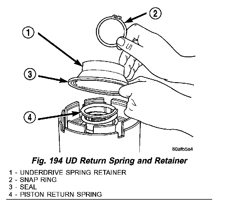 10. Position the UD spring retainer (1) and snap ring (2) on the piston return spring (4) (Fig. 194).
