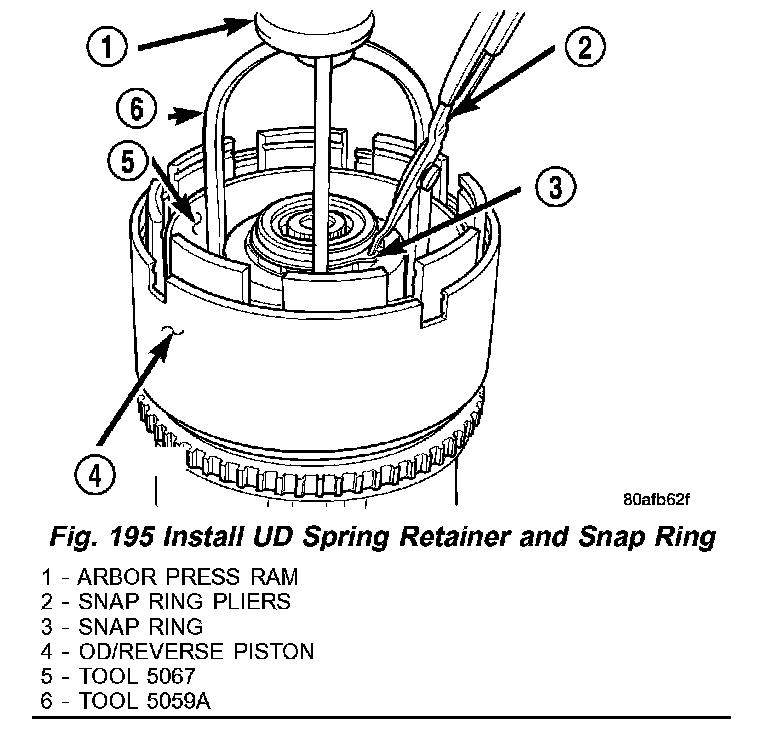 11. Using Tool 5059A (6) and an arbor press install the UD spring retainer and snap ring (3) (Fig. 195).