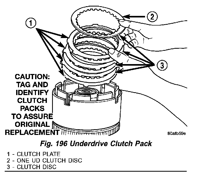 12. Install the UD clutch pack (four fibers/four steels) (1, 3) (Fig. 196). Leave the top disc (2) out until after the snap ring is installed.