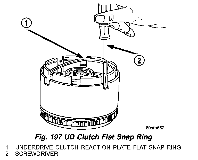 13. Install the UD clutch flat snap ring (1) (Fig. 197).
