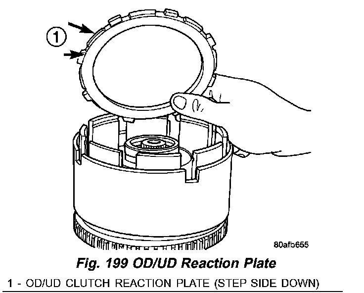 15. Install the OD/UD clutch reaction plate (1) (Fig. 199). The OD/UD clutches reaction plate has a step on both sides. Install the OD/UD clutches reaction plate tapered step side up.