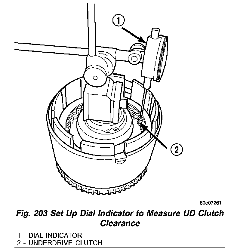 19. Set up dial indicator (1) on the UD clutch pack (2) (Fig. 203).