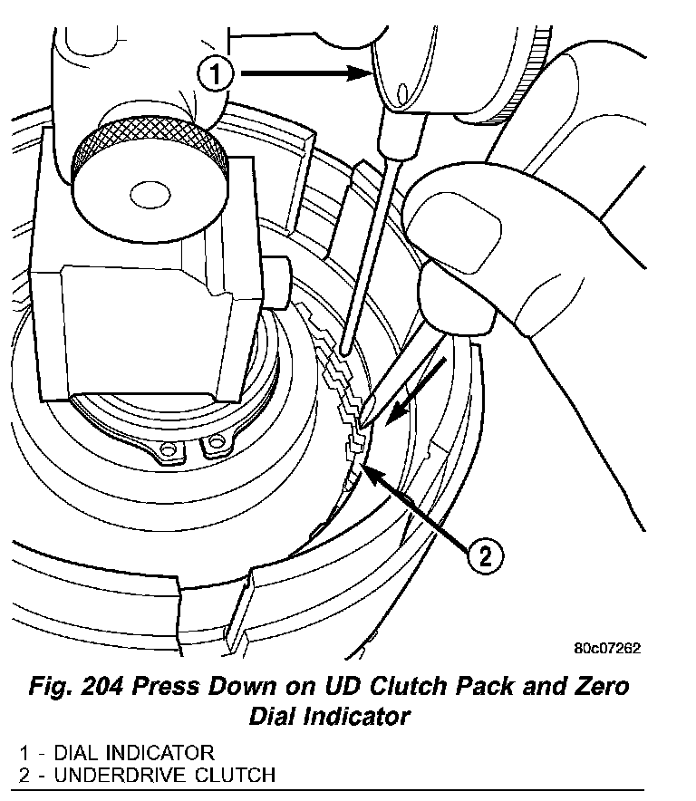 Fig. 204 Press Down on UD Clutch Pack and Zero Dial Indicator: