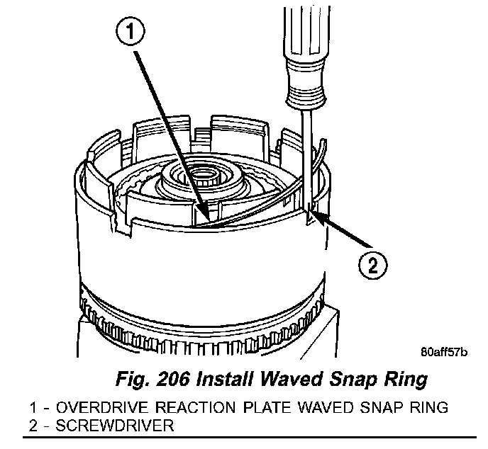 25. Install OD reaction plate waved snap ring (1) (Fig. 206).