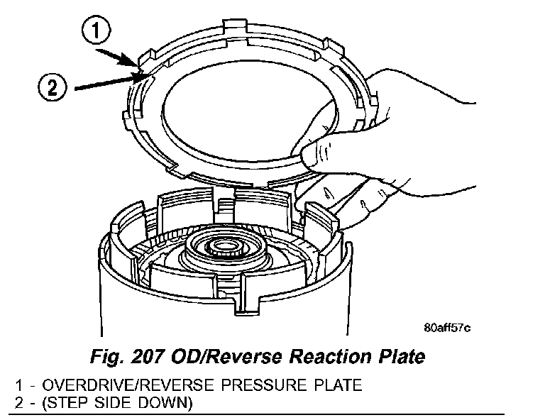 26. Install the OD/Reverse reaction plate (1) with large step down (towards OD clutch pack) (Fig. 207).