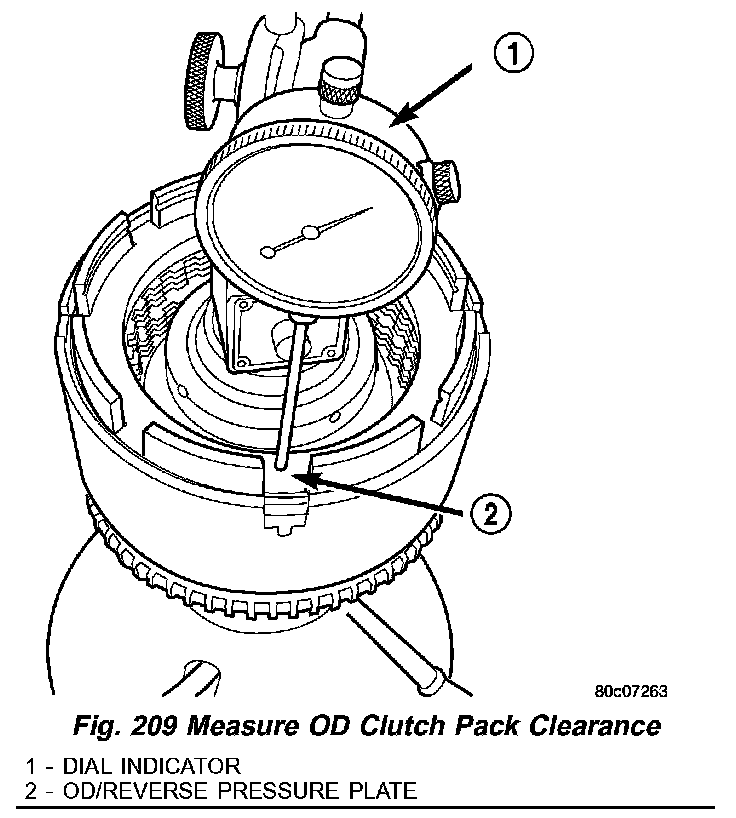 28. Measure OD clutch pack clearance. Set up dial indicator (1) on top of the OD/Reverse reaction plate (2) (Fig. 209).