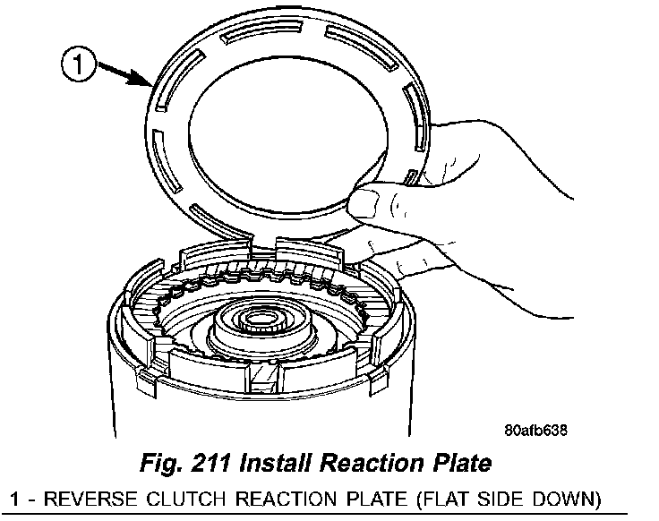 32. Install reverse clutch reaction plate (1) with the flat side down towards reverse clutch (Fig. 211).
