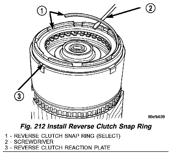 33. Tap reaction plate (3) down to allow installation of the reverse clutch snap ring (1). Install reverse clutch snap ring (1) (Fig. 212).