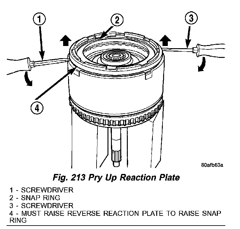 34. Pry up reverse reaction plate (4) to seat against snap ring (2) (Fig. 213).