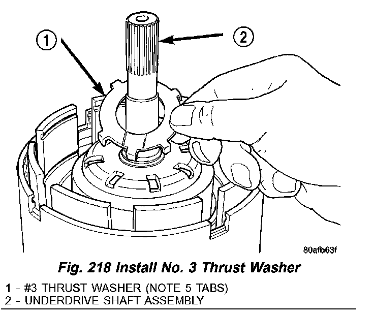 42. Install the number 3 thrust washer (1) (Fig. 218) to the underdrive shaft assembly (2). Be sure five tabs are seated properly