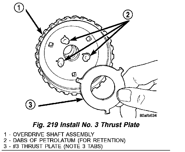 43. Install the number 3 thrust plate (3) to the bottom of the overdrive shaft assembly (1). Retain with petrolatum or transmission assembly gel (2) (Fig. 219).