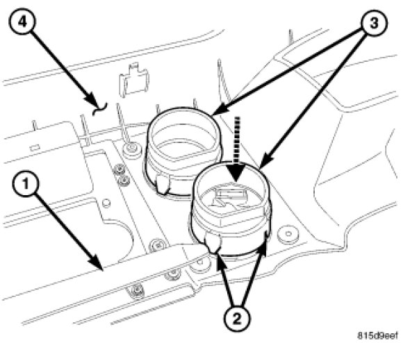 2. Using a trim stick or another suitable wide flat-blade tool (1), release the three retaining clips (2) that secure each instrument panel air outlet (3) to the instrument panel bezel (4) and remove the air outlets as necessary.