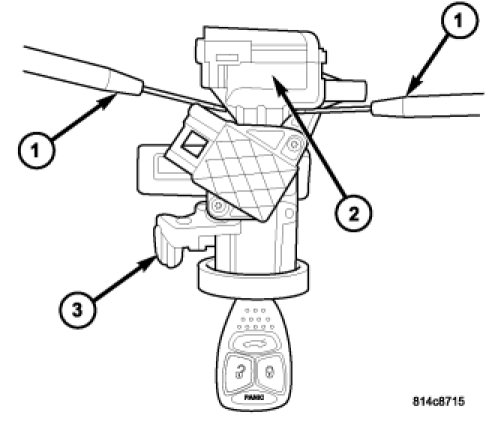 12. To remove key lock cylinder (1) from housing (2), rotate key to ON position while pressing on release tab (3).