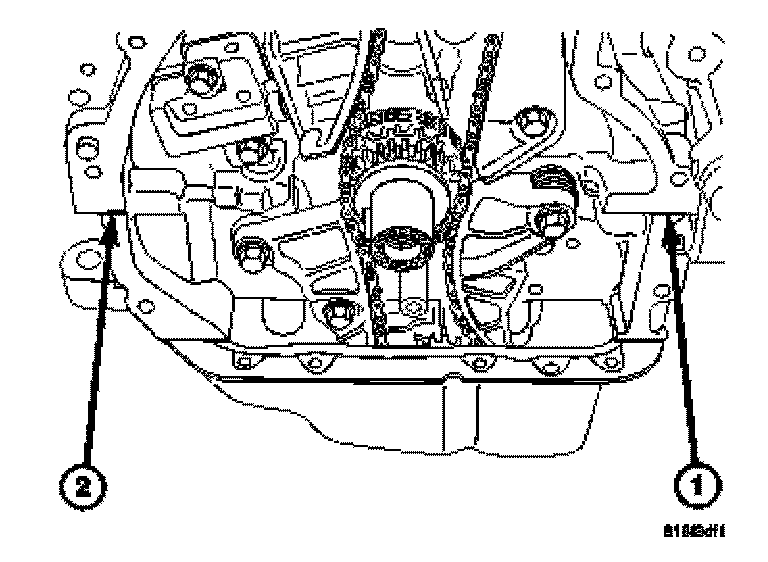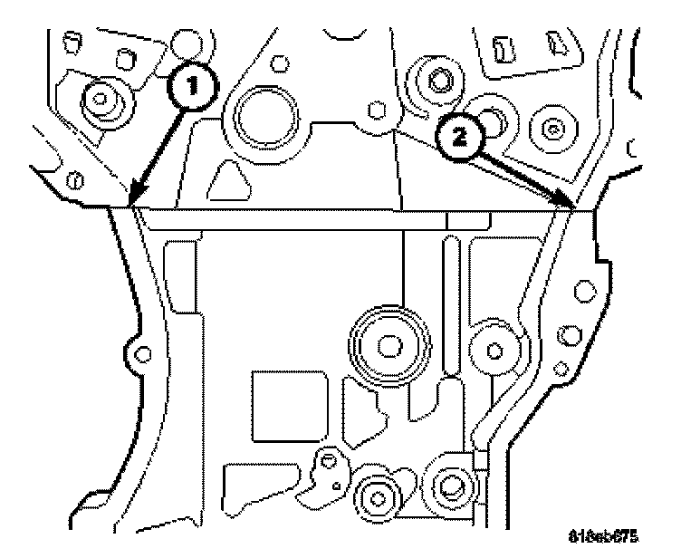 6. Apply 2 mm bead of Mopar engine sealant RTV or equivalent to the engine block (1,2) as shown.