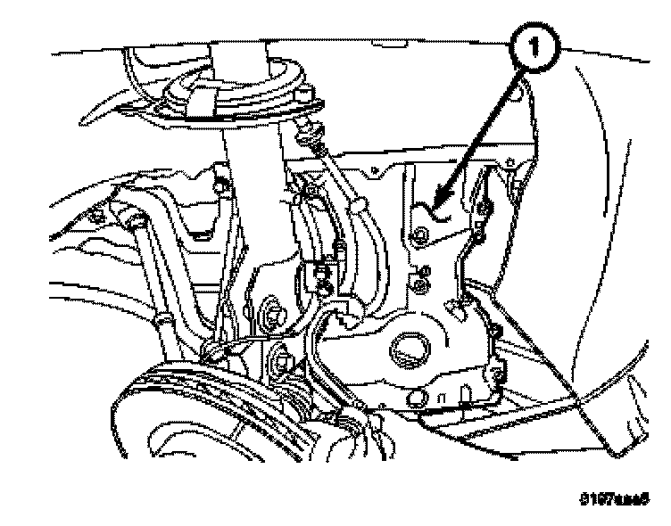 7. Install timing chain cover (1) upwards from under the vehicle.