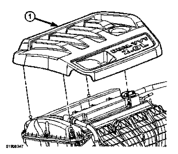 38. Install engine cover (1) by pressing the rear of the cover down first.