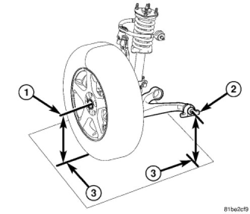 2. Front Cradle Height - On each side of the vehicle, measure the vertical distance between the center of the lower control arm forward pivot bolt (2) to the ground (3) Record the measurement.
