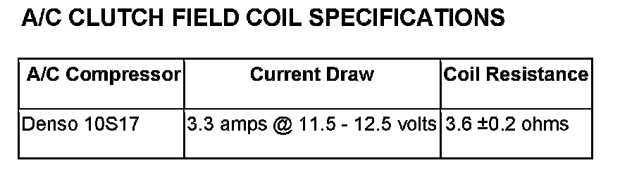 6. Refer to the A/C Clutch Field Coil Specifications chart for the acceptable A/C clutch coil resistance. Specifications apply for a work area temperature of 21° C (70° F).