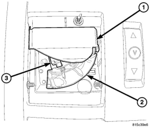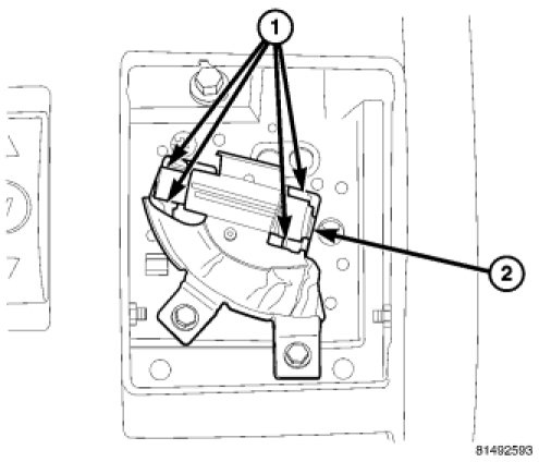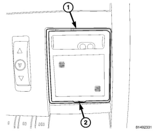 5. Engage the switch tab (1) on the rearward edge of the lens (2) between the overhead console and the switch plunger.