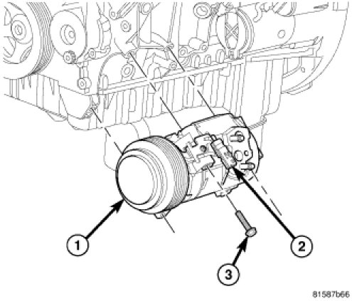 3. Install the three bolts (3) that secure the A/C compressor to the engine. Tighten the bolts to 55 Nm (41 ft. lbs.).