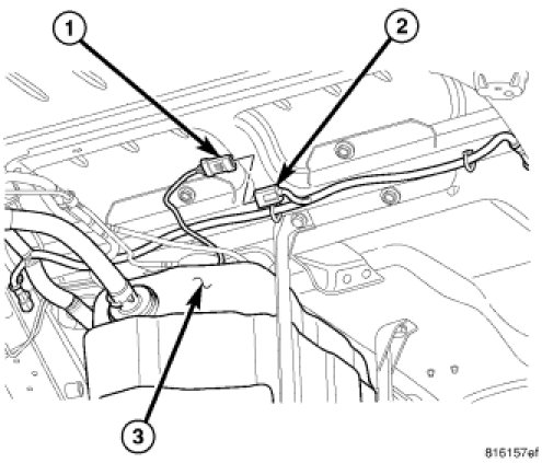 10. Connect pump module electrical pigtail connector (1) to body wiring harness connector (2).