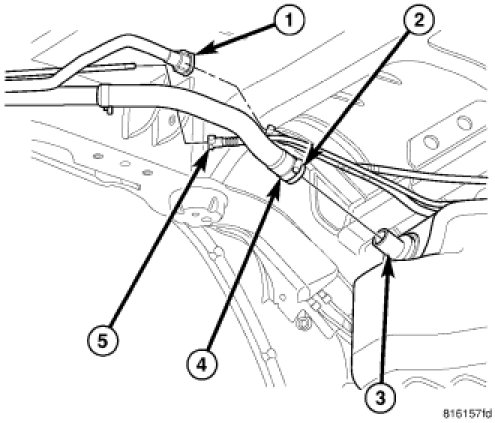 8. Connect fuel vent connectors (1) and (5) at rear of tank.