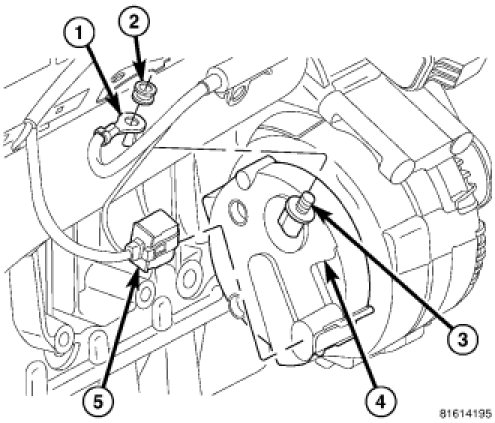 2. Install battery B+ cable eyelet (1) and nut (2) to generator mounting stud (3).
