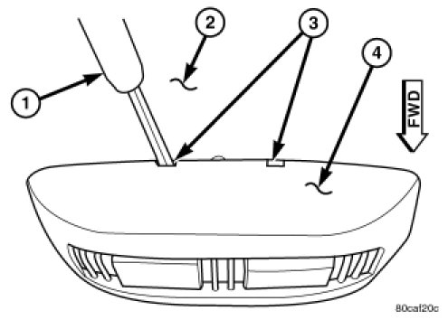 2. While lightly pulling downward on either rear corner of the Intrusion Transceiver Module (ITM) trim cover (4), insert a small thin-bladed screwdriver (1) through each of the service holes (3) on the rear edge of the trim cover to depress and release the two integral rear latch features of the module from the mounting bracket above the headliner (2).